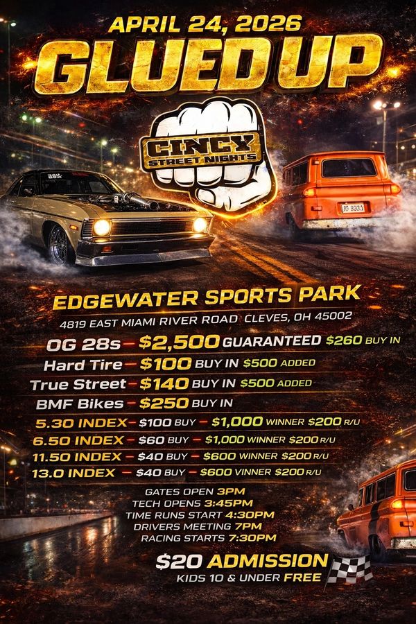 We start off with Tune & Test Thursday evening followed by Friday's prepped track, heads up Cincy Street Nights event. Saturday bring our 1st points bracket race.