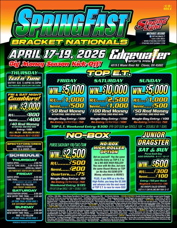 This weekend brings our season kick-off of the big money races! Thursday evening is Tune & Test, Friday evening time runs & Gambler's race, Saturday and Sunday the full race program!